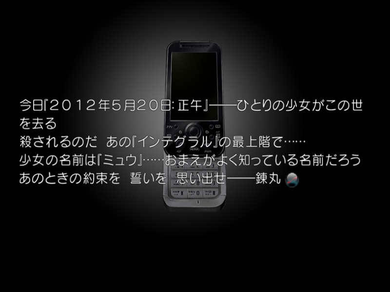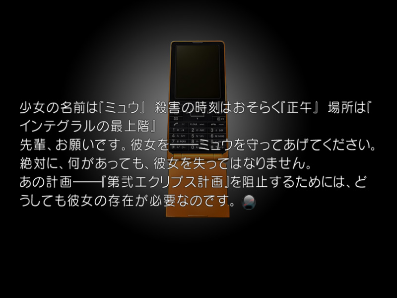 一方,鳴海に届いたメールの送り主は,同じ公安十二課所属の後輩,雪積真琴。メールには,ミュウが殺されるのは世界を破滅させる「第弐エクリプス計画」のためで,計画阻止のためにはミュウが必要だと書いてあった。真琴を信じ,インテグラルに向かう鳴海。到着すると,そこには何者かに捕まっている少女がいた。