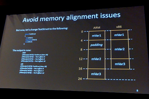 ただ,同じCやC++のソースコードを使うと,まれにx86環境で問題が生じることもある,とGranatir氏。最初の問題として取り上げられたのが,メモリ上におけるデータの並び方「アラインメント」(Alignment)の違いだった。x86だと並べ方にこれといった制限がなく,キャッシュ境界をまたぐと性能が低下するという問題がある程度なのだが,ARMは8bytesの境界をまたいでデータを並べたりしてはいけないCPUアーキテクチャになっている。