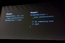 x86ではメモリのリード/ライトがプログラムで指示された順番に従うと保証されているのに対し,ARMではそれがない。なので,2つのスレッドが同じフラグ(変数)を参照するときには,変数の変更順序がプログラムどおり行われない可能性を考慮して,組み込み関数で同期を取る必要があるというのが,ここでのポイントになる。