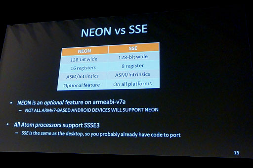 ちなみにGranatir氏は「SSEはすべてのAtomプロセッサでサポートしているのに対し,ARMのNEONはオプション」と述べ,少し自慢げな顔をしていたが,ARMv7に対応した現行世代のARMコアはたいていがNEONをサポートしているので,氏がスライド中で指摘するほど,そこに大きな違いはないようにも思われた。
