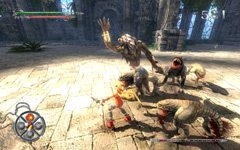 チュートリアルが終了すると,いよいよ本格的な戦闘の始まりだ。古代寺院に隠されたアーティファクトを守護する,ライオンの頭を持った人間のようなクリーチャーと,トカゲのようなザコ敵が現れる。ザコは剣や銃で倒しつつ,ライオン頭のボスにFireballの魔法をお見舞いするといい感じに進むだろう。ある程度ボスにダメージを与えると,カットシーンが挿入されてデモ版は終了だ。