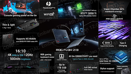「ROG Flow Z13」は,着脱式キーボードを備えたゲーマー向けの2-in-1ノートPCで,薄さ12mm,公称本体重量約1.1kgの筐体に,ノートPC向け第12世代Coreプロセッサの14コアモデル「Core i9-12900H」と,「GeForce RTX 3050 Ti」を搭載したのが特徴だ。