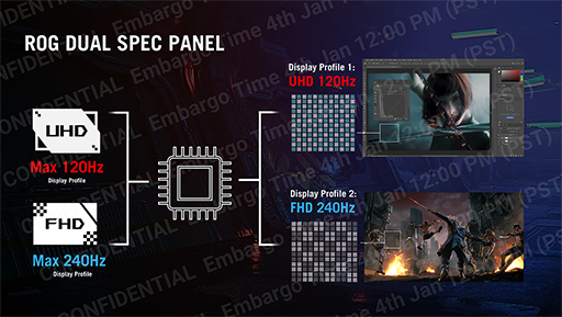 さらにROG Zephyrus Duo 16の最上位モデルは,ASUSが「ROG Dual Spec Panel」と呼ぶ液晶パネルを採用したのも見どころである。ROG Dual Spec Panelは,専用チップにより,解像度3840×2400ドットで垂直最大リフレッシュレート120Hzと,解像度1920×1200ドットで垂直最大リフレッシュレート240Hzという2つの解像度とリフレッシュレートを切り替えられるという。