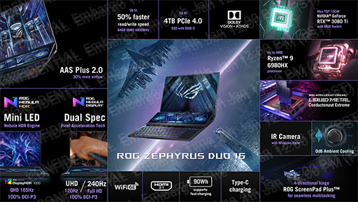 16インチ級ノートPC「ROG Zephyrus Duo 16」は,通常のディスプレイに加えて,キーボード奥側に横長のタッチ対応サブディスプレイ「ROG ScreenPad Plus」を搭載した2画面搭載PCの新製品だ。CPUに「Ryzen 9 6980HX」を,GPUには発表されたばかりのノートPC向け「GeForce RTX 3080 Ti」を採用する。
