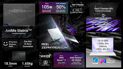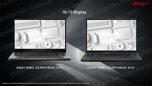 14インチ級の薄型ゲーマー向けノートPC「ROG Zephyrus G14」の2022年モデルは,CPUに「Ryzen 9 6900HS」を搭載することと,AMDの最新ノートPC向けGPU「Radeon RX 6800S」を搭載したのが特徴だ。ディスプレイは,ROG Zephyrus Duo 16と同じくアスペクト比16:10の液晶パネルを採用しており,縦方向に少し広くなっている。パネルの解像度は2560×1600ドットで,垂直最大リフレッシュレートは120Hzだ。