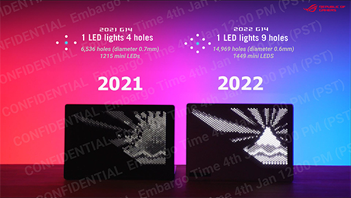 天板にドット絵を表示できる「AniMe Matrix Display」は,従来製品と比べてドットの孔が増えており,ドット絵を明るく表示できるという。