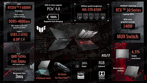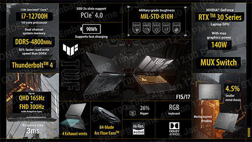TUF Gamingブランドの新型ノートPCは,すべての製品で米国国防総省が定める軍事規格のMIL規格(MIL-STD-810H)に準拠したテストをクリアした耐久性の高さを備えているのが見どころだ。ディスプレイも全製品で解像度1920×1080ドット,最大リフレッシュレート300Hz,または解像度2560×1440ドットで最大リフレッシュレート240Hzという2種類の液晶パネルを用意するという。