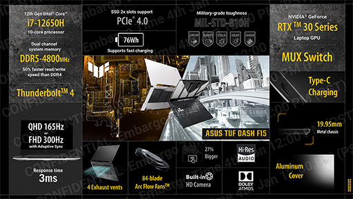 15.6インチ級のゲームノートPC「TUF Dash F15」は,薄さ19.95mmの筐体にCore i7-12650HとGeForce RTX 30シリーズを搭載したのが特徴だ。