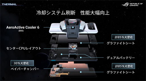 ROG Phone 6シリーズは,ハイエンドSoCが発する熱を抑えるために,筐体内部の冷却機構を大幅に強化したのが特徴だ。メインの回路基板と通信用のRF基板の冷却に,窒化ホウ素を用いたTIM(Thermal Interface Material)を採用したり,大型の放熱用グラファイトシートとベイパーチャンバーを搭載したりすることで,SoCの熱を効率的に逃がせるそうだ。