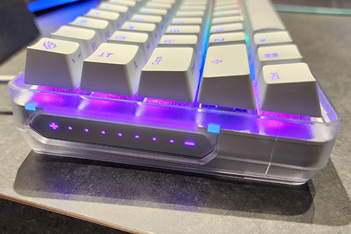 Falchion Aceで面白いのは,左側面にタッチパネルを組み込んでいることだ。側面タッチパネル上で指を前後に動かすと,PCの音量調整を行える。音量調整以外の機能を,PC用ソフトウェアから割り当てることも可能である。