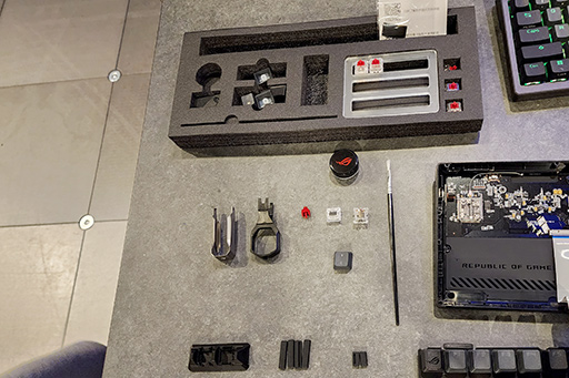 Azoth第3の特徴は,キースイッチのカスタマイズにある。キースイッチ自体は,Falchion Aceと同じROG NXであるが,付属の工具でキーボード本体からスイッチを取り外して,別売りのスイッチと交換できるのだ。スイッチを付け外すだけでなく,スイッチ自体を分解して内部を掃除したり,内部に潤滑剤を塗ったりもできる。キーボードを徹底的にカスタマイズしたいというマニアなら,楽しめそうなポイントだろう。