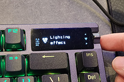 Azothにおける2つめの特徴は,右奥側に備えた小型のモノクロ有機ELディスプレイと,その横にあるダイヤル型のスイッチ「3方向コントロールノブ」だ。キーボードで設定変更と言えば,PC上の設定ソフトを使うか,[Fn]キーと他のキーを組み合わせて押すのが定番である。それがAzothでは,有機ELディスプレイ上に設定を表示して,3方向コントロールノブを上下に傾けたり,ノブの中心にあるボタンを押したりすることで,設定内容を変更できるのだ。