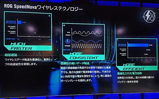 SpeedNovaは,低遅延と電波干渉の悪影響を受けにくいのが特徴のワイヤレス通信技術であるという。同種の技術は,Logitech G(国内ではLogicool G)やRazer,Corsairといったゲーマー向け周辺機器の専門メーカーがすでに採用しており,そうした技術をASUSも自社のマウスに採用してきたと言えよう。