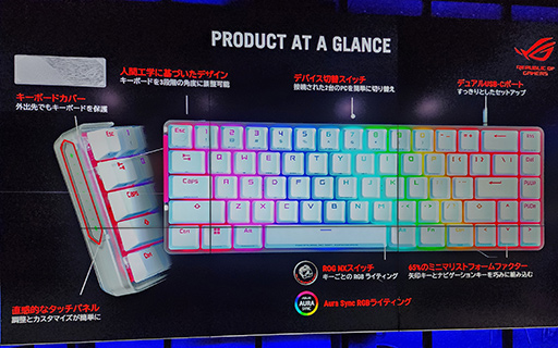 もう1つの10キーレスキーボードである「ROG Azoth」(エイゾスまたはアゾス,以下 Azoth)は,ACE SERIESではないが,他社のゲーマー向けキーボードにもない仕様を備えた製品だ。