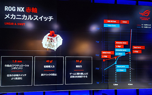 Falchion Aceは,キースイッチにASUS独自の「ROG NX Mechanical Switch」(以下,ROG NX)を採用している。ROG NXは,いわゆるCherry“赤軸”に似た特性を持つキースイッチだ。キーを押し始めたときの押下荷重は40gであるが,深さ約1.8mmのアクチュエーションポイントでは45gに,アクチュエーションポイントよりも深く押し込む場合は,徐々に強まって最終的に55gになるというリニアに変化する特性を有する。基本的にはCherry“赤軸”風の打鍵感で,日本のゲーマーにも受け入れられやすいだろう。