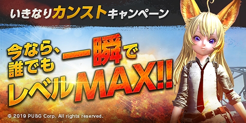 本日2019年2月20日(水)メンテナンス後より、 コラボレーションを記念して、 誰でも最高レベルからゲームを始められる「いきなりカンストキャンペーン」を開始いたします。 初めての方はもちろん、 現在プレイ中の方も、 新しいクラスに挑戦する絶好のチャンスとなっております。 『PUBG』コラボを最大限楽しむためにも、 すぐに最高レベルに到達できるこの機会に、 ぜひPC版『TERA』をプレイしてみてください。