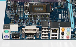 同じくP55マザーボードとして公開されたGA-HDには,I/Oインタフェース部にDVI-I,HDMI,Display Portと3種類のグラフィックス出力端子が並ぶ。これは,同じIbex Peakファミリーでも,