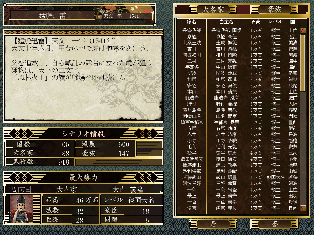 「天下統一V」各シナリオの最貧大名で戦っていく本連載,第2シナリオの真田家に続いては,第1シナリオ(1541年スタート)の長宗我部家に挑戦する。シナリオ冒頭における石高ソートなる厳正極まりない選出方法により,栄えある最貧大名に選ばれましたということで,まことにありがた迷惑な白羽の矢が四国の地に深々と立ったのである。当主 国親公には他人の迷惑顧みず,覚悟を決めて天下を目指してもらおう。