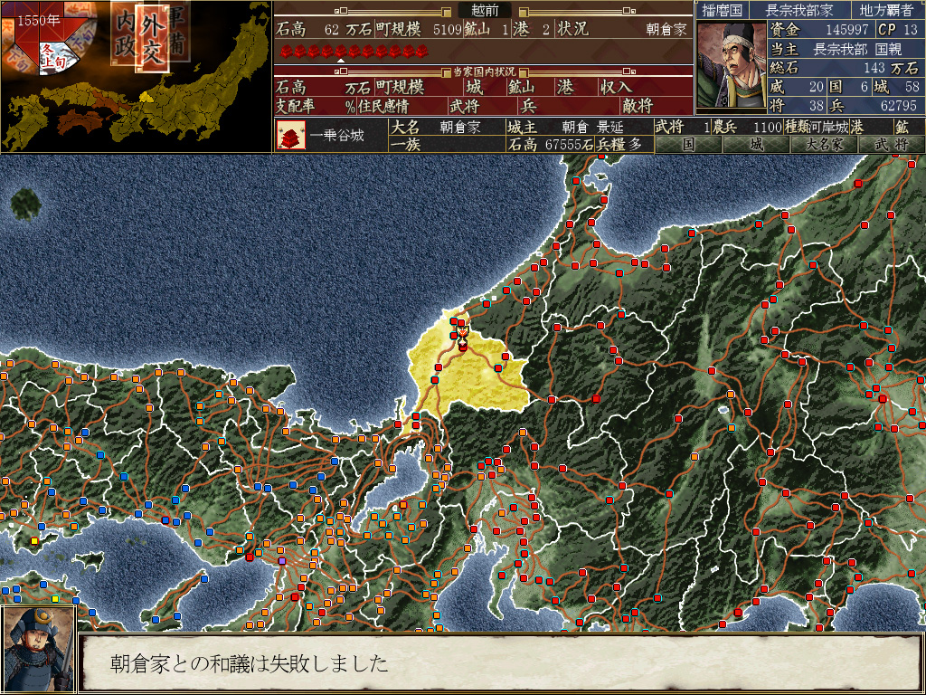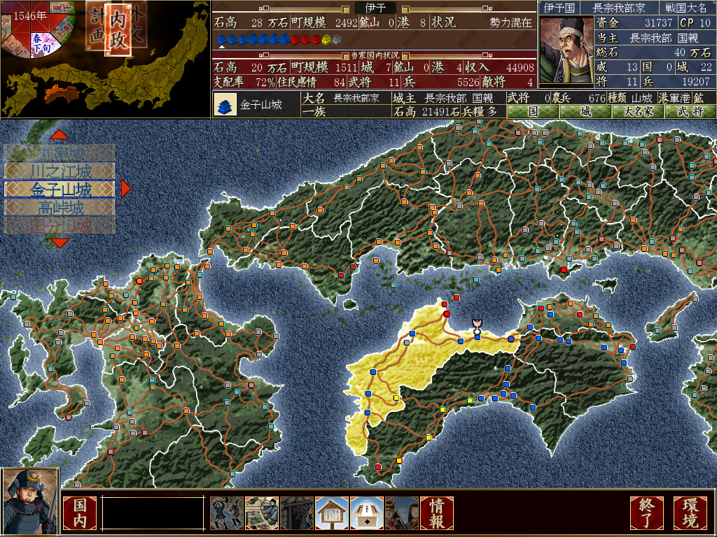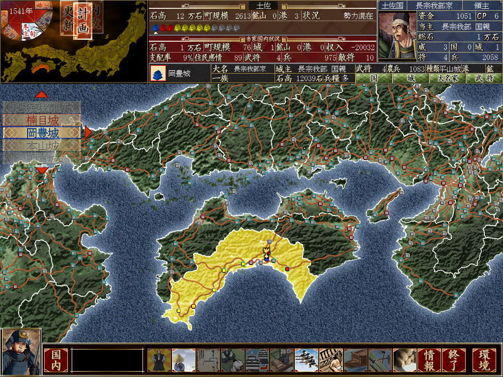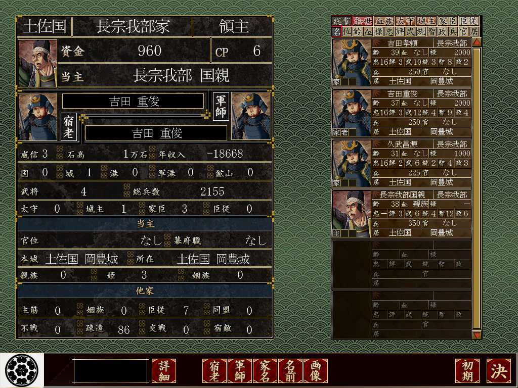 真田家に続き,またも城一つからのスタートで,おまけに城の所在国である土佐(高知県)には都合三つの大名家が配されている。客観的に見ると,長宗我部家はそのうちの一つというより,一条家の有力な家臣にすぎない。主家である一条家は,お隣伊予(愛媛県)の西園寺家と同様に,摂関/羽林家の一員が領国に下って,現地の荘園経営に活路を求めたという由来の方々で,ゲーム内的にはともかく,やんごとなさは折り紙付きだ。