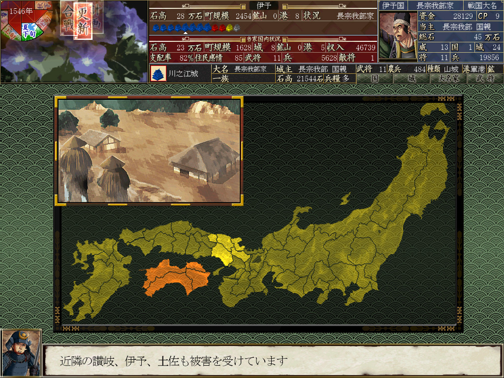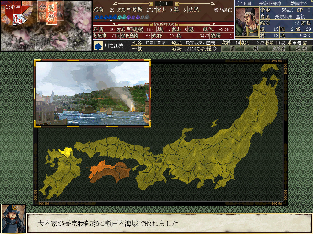 河野家を打ち倒す頃には石高も16万石くらいに成長していて,年貢収入から俸禄や兵/城の維持費を差し引いたグロスの収支は黒字に転じているはず。四国といえども西国であって,そもそも町場からの収入は多い。それをやりくりして毎ターンの戦をこなせるので,序盤の長宗我部家が財政的に破綻する心配は,あまりないだろう。