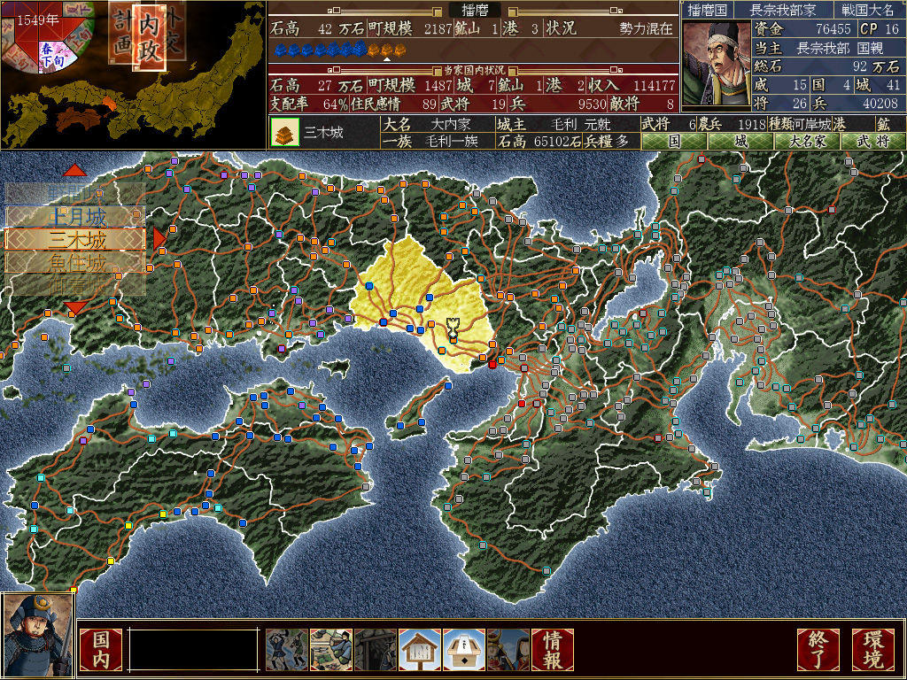 二つめは,播磨が非常に豊かな土地であること。これがすんなり敵の手に渡れば苦戦は必至だし,我が方が手にすれば大きな支えとなる。正直,陶や尼子が大内を押し留めていてくれさえすれば,こんな心配はなかったのだが,どのみち本州への進出は我が家にとっても既定の路線である。ならば,最も合理的な手を選びたい。