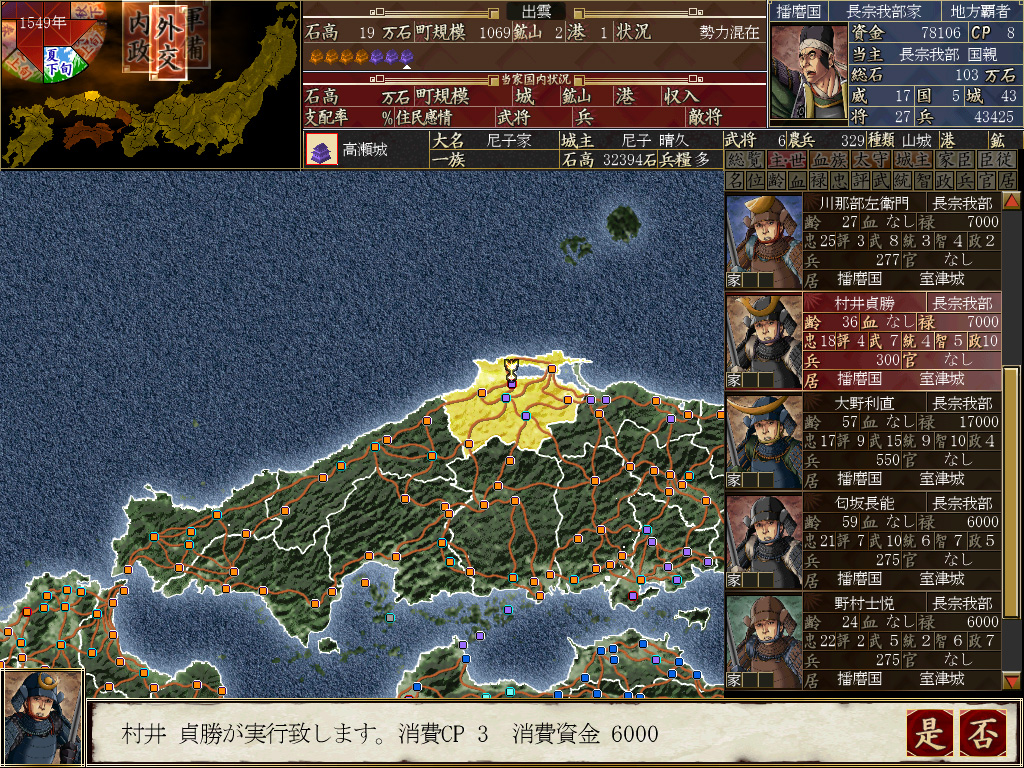 尼子との連携を策しつつ,我が将兵は播磨室津に上陸する。所領の規模が大きいだけに,大内方の豪族衆は軍勢も大きく,これを打ち倒すのはなかなかの手間ではあったものの,平定は順調に進む。