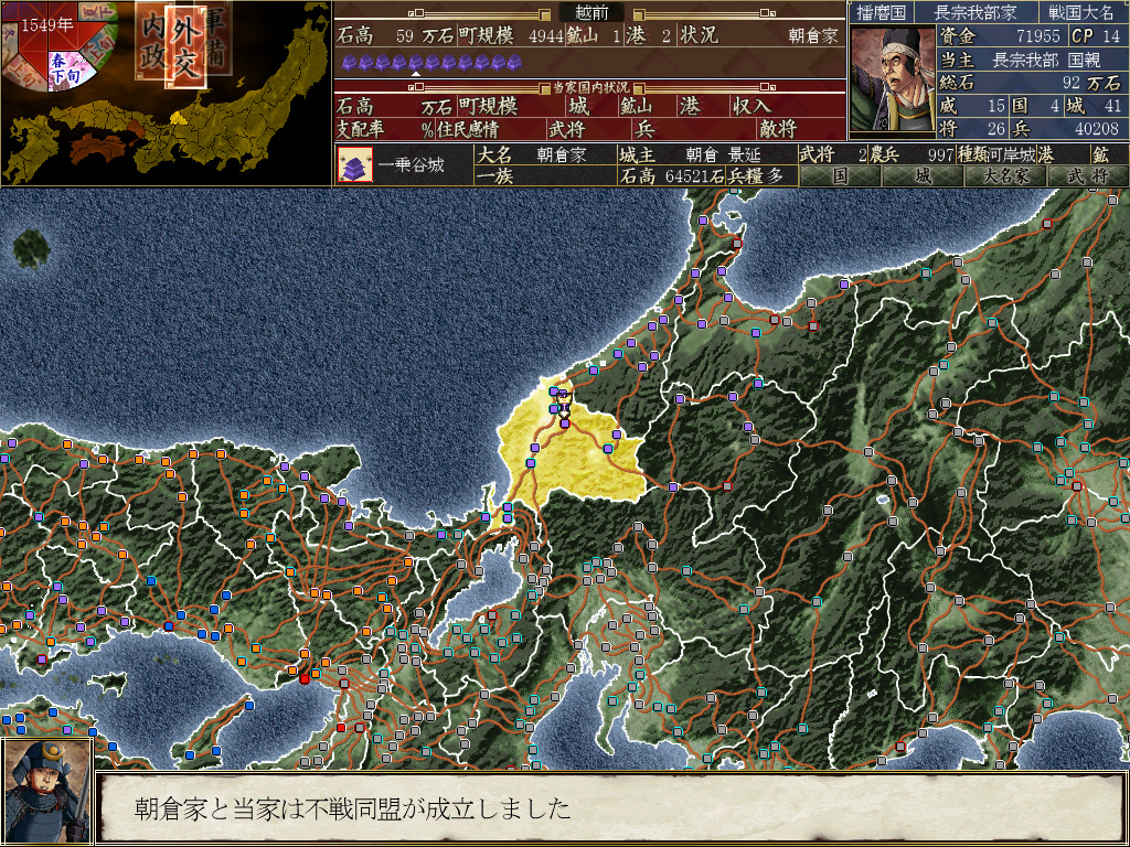 尼子家が敵に降り,大友家と陶家をそれぞれ四国に存続させている我が家は外交方針を刷新,朝倉家,六角家への接近を目指したのである。