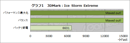 その代わりというわけではないが,先述したプロセッサ設定を変更して,スコアの変動をチェックしてみた。下のグラフ1が計測結果である。プロセッサの設定をパフォーマンス最大化,バランス,バッテリ節電と切り替えて,それぞれでIce Storm Extremeを計測したものだ。なお,何度か測定してみたがスコアのぶれはごくわずかだったので,1回分の結果を採用している。