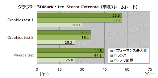 次のグラフ2は,各テストにおける平均フレームレートを比較したものだ。Graphics Test 1では,パフォーマンス最大化とバランスは60fpsに近い数字で安定している。パフォーマンス最大化のスコアがバランスのそれとほぼ同じということは,この2項目は3DMarkにおいて,性能差がないといえそうだ。