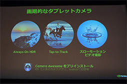 ただし撮像素子の画素数は普通でも,Tegra Note 7は撮影機能として,タイムラグなしでHDR写真を撮影できる「Always-On HDR」といった,今までのタブレット端末にはない特徴を備えている。Always-On HDRは12月中に提供予定のアップデートで有効化されるとのことで,残念ながら今試すことはできないのだが,見落としてはいけないポイントであろう。