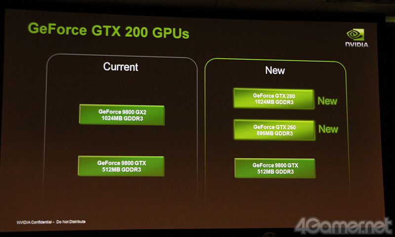 製品ラインナップの詳細も確認しておこう。GeForce GTX 280とGeForce GTX 260は,いずれも「GeForce 9800 GX2」の置き換えが想定されており,GeForce 9世代のシングルGPUハイエンド「GeForce 9800 GTX」は,GeForce GTX 200シリーズの下に置かれることになる。北米市場における搭載グラフィックスカードの想定売価は,GeForce GTX 280が649ドル,GeForce GTX 260が399ドル。それぞれ,主要スペックは以下のとおりだ。