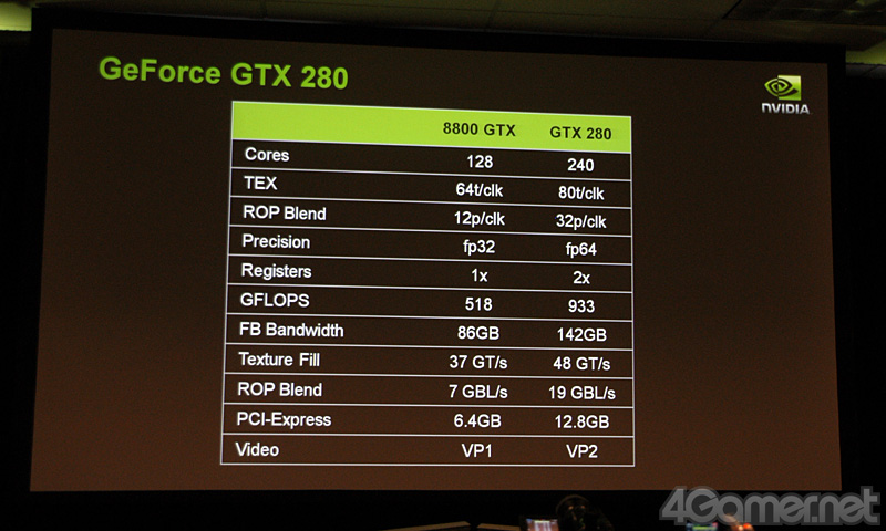 下に示したのは,NVIDIAによる,GeForce 8800 GTXとGeForce GTX 280の詳細スペック比較だ。