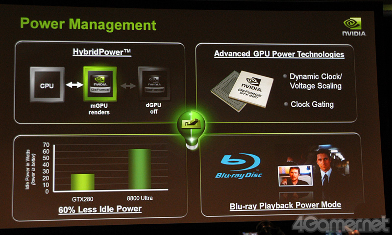 ところで,今回の発表ではSLIについて詳しい言及はまったくなかったが,GeForce GTX 280,GeForce GTX 260ともに,NVIDIA SLI(以下,SLI)コネクタが二つ用意されている点,NVIDIAの公開した資料に3枚差しのイメージがあったことから,3-way SLIに対応しているのはまず間違いない。Hybrid SLIに関しては,HybridPowerのみ対応しているとのことだ。