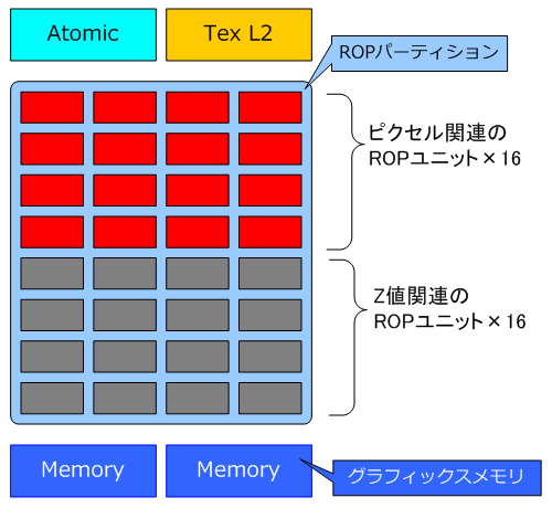 ブロック図全体に再び目を向けると,10基あるシェーダクラスタ(=TPC)の下には「Atomic」および「Tex L2」というブロックがあり,さらにその下には,赤と黒の四角が複数並んでいるブロックがある。