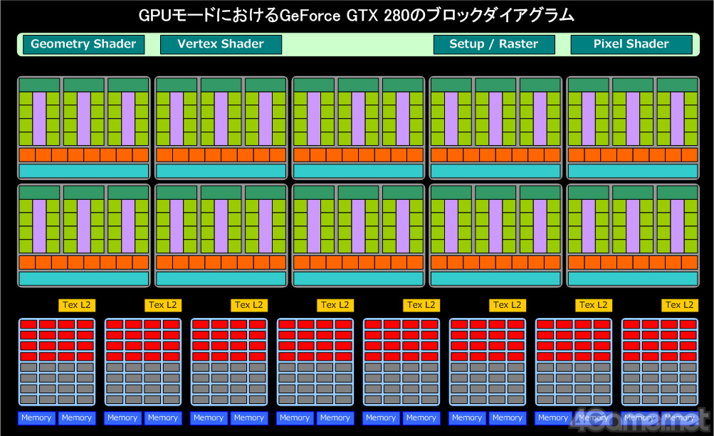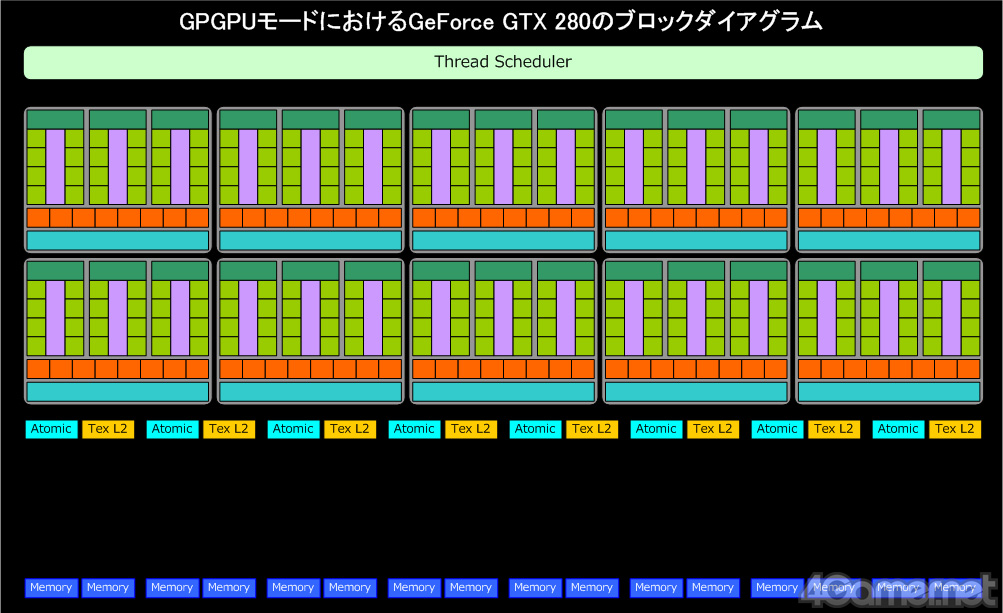 全体でひとかたまりのイメージになる,AtomicとTex L2,そしてROPパーティション。GeForce GTX 280はこれが8ブロック,GeForce GTX 260は7ブロック用意される。ちなみにGeForce 8800 GTXは6ブロック,GeForce 9600 GTXは4ブロックだった