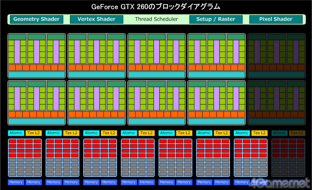 こちらはGeForce GTX 260のブロックダイアグラム。基本的にはGeForce GTX 280と同じだが,TPCが2ブロック少なく(192SP),ROPパーティションも1ブロック少ない(28ROPs相当)コンフィグレーションになる
