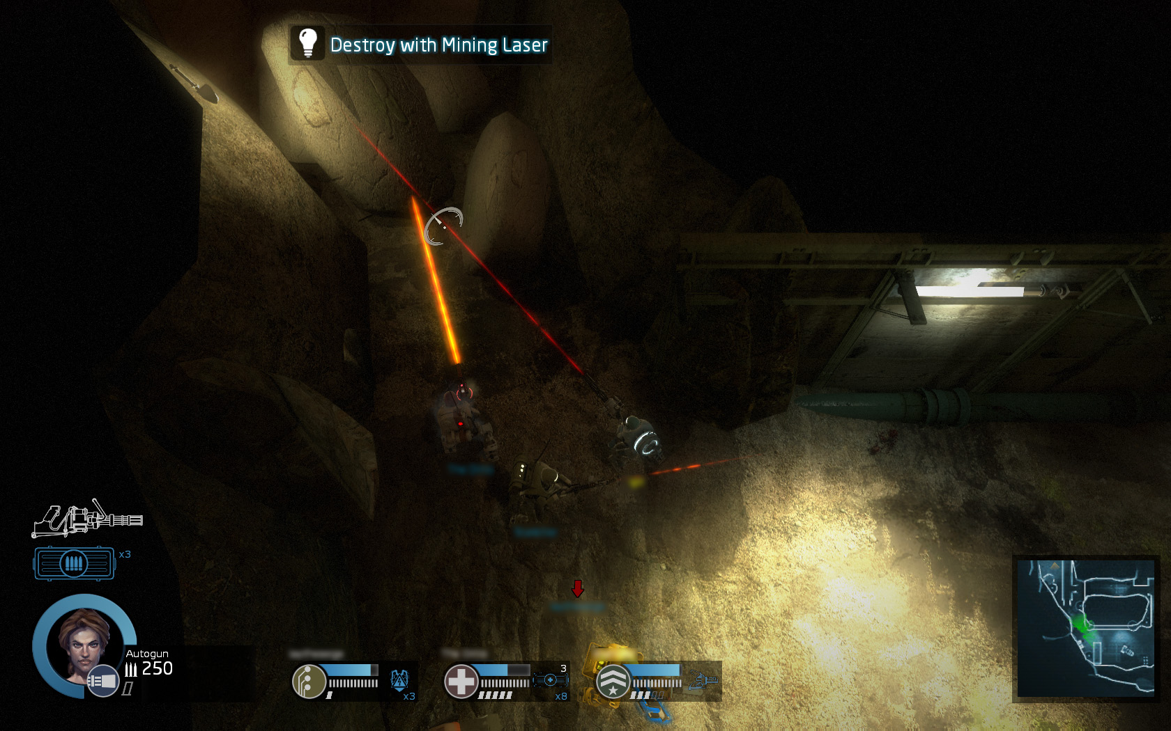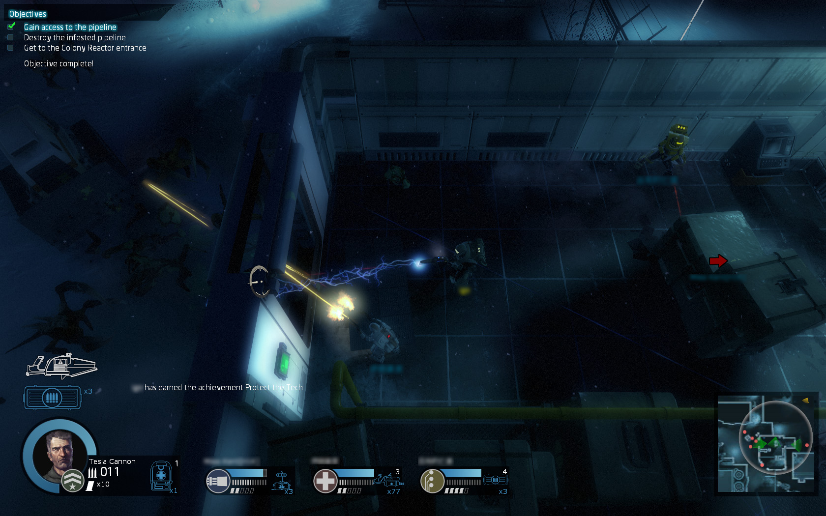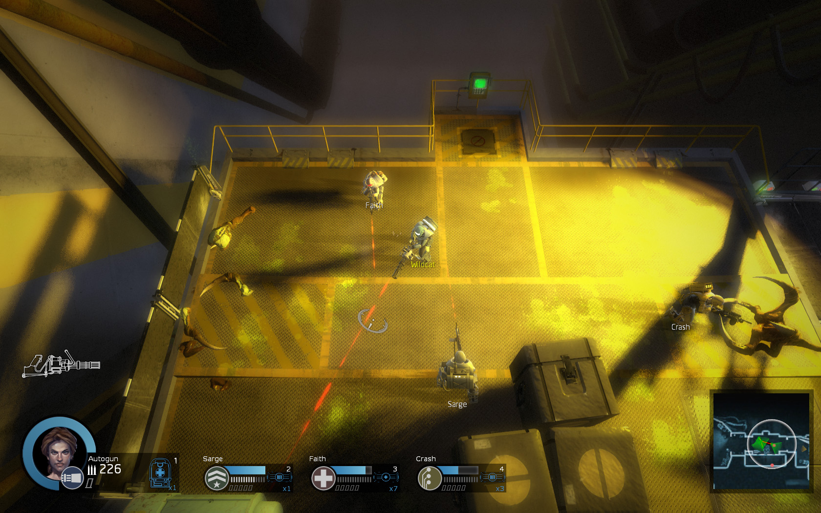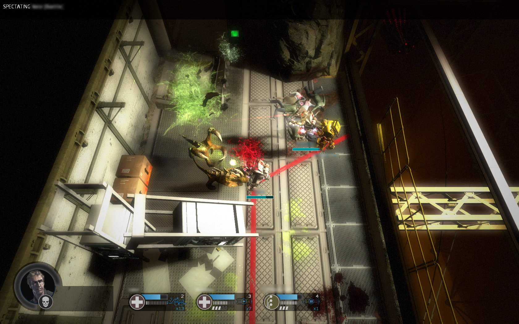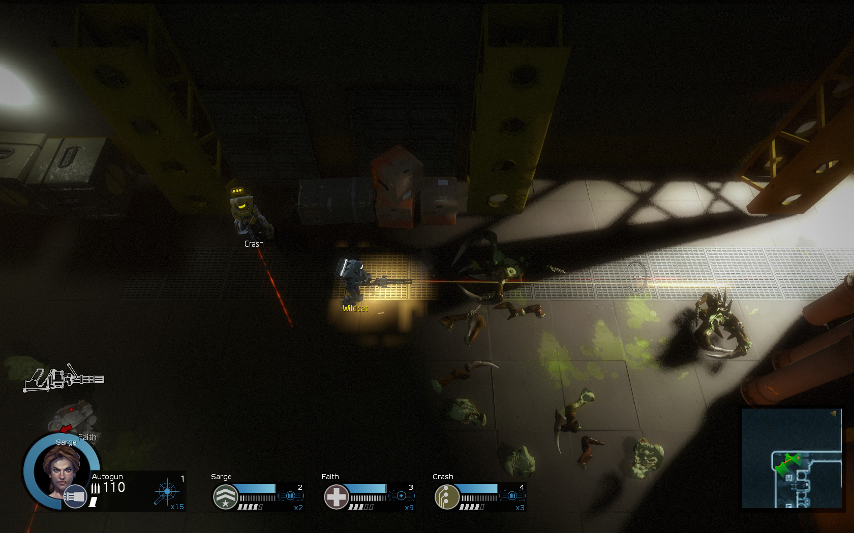 シンプルな操作と相まって,プレイ感覚はとてもパワフル&スピーディだ。プレイヤーがやるべきことは,周囲のあらゆるところから襲ってくる,昆虫のような姿をしたエイリアンを撃ちまくって倒しながら,ほぼ一本道のマップを突き進んでいくだけ。だが,ルートの途中にはTechの開錠能力が必要なロックされたドアがあったり,特定のクラスでしか扱えない武器が必要となるといったヒネリが加えられており,プレイヤー同士の協力が必須だ。