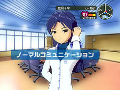 ゲームを始めて最初に登場したのは,頭にリボンをつけた可愛い女の子。ここで三択になるので,私はきわめて適当に「運命の出会いを信じてる?」を選んだのだが(ゲーム的には,ここは何を選んでもかまわない),今にして考えると,まさに運命の出会いとしか思えない。あ,なんかカッコいい。