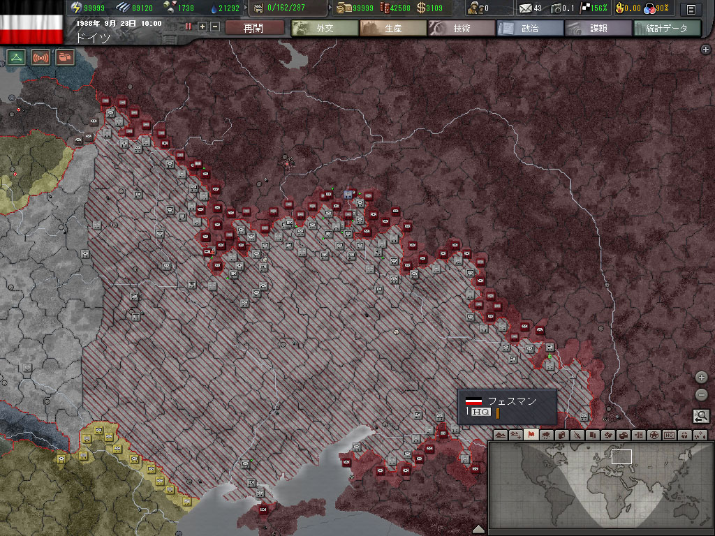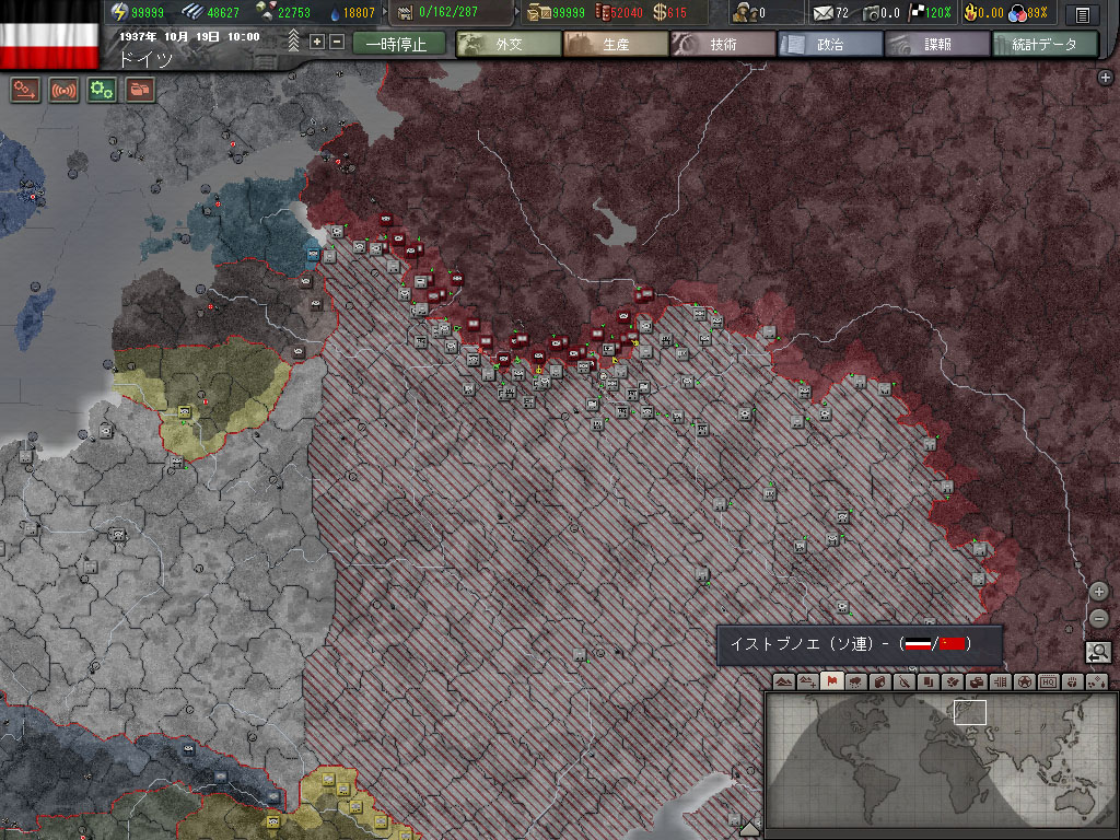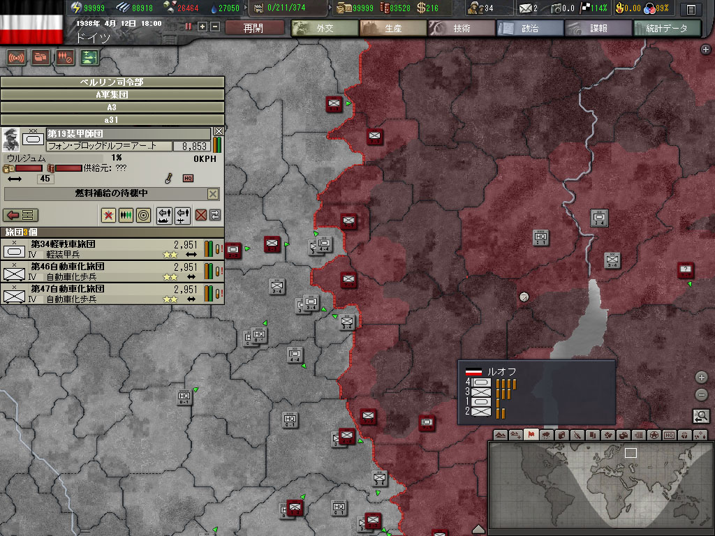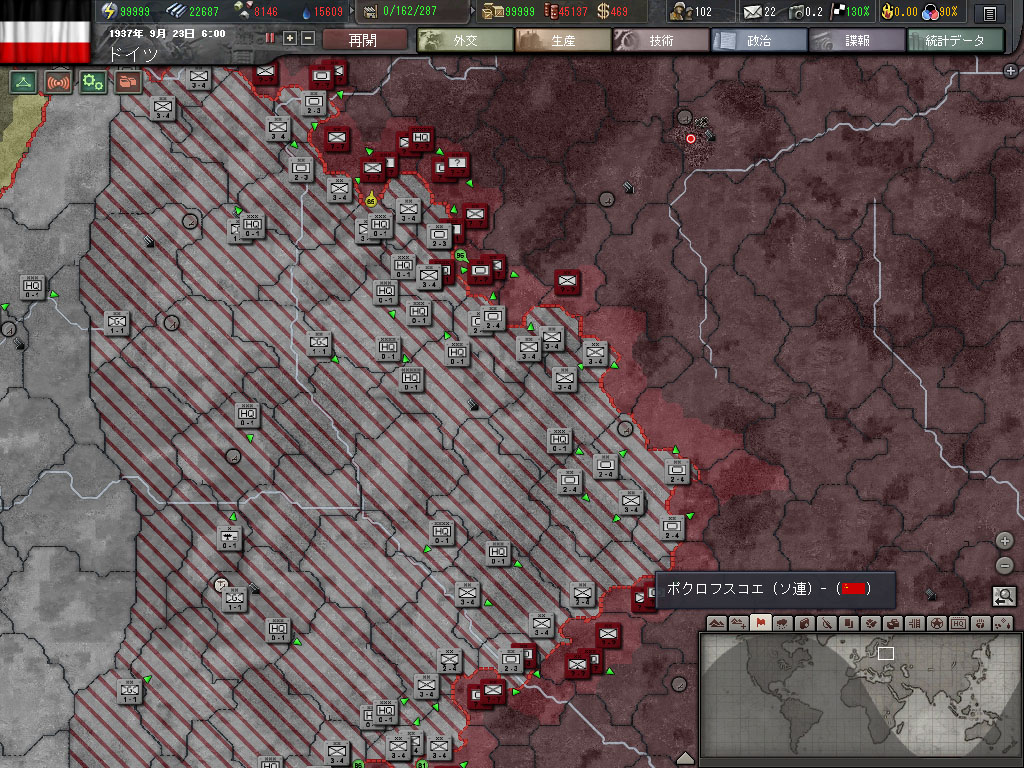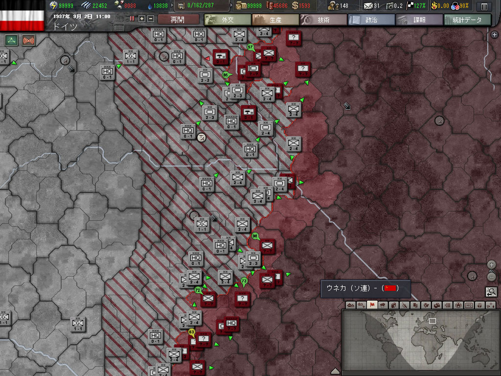 我がドイツの工作によるポーランド制裁戦争は,1937年6月に終結(前回参照)。当然ながらこれはオードブルなので,動員は解除しない。ベルリン司令部には「防御」の指示を出し,旧ポーランド・ソビエト国境にドイツ軍を整列させる。