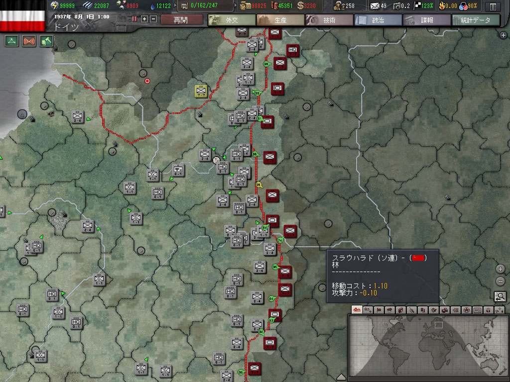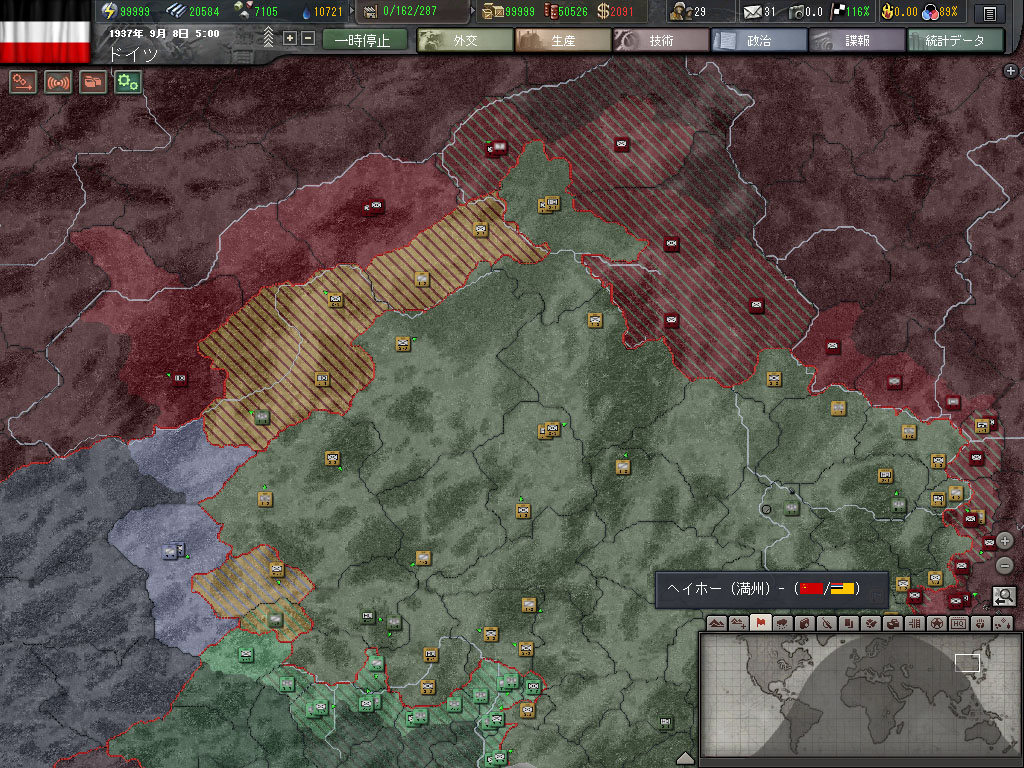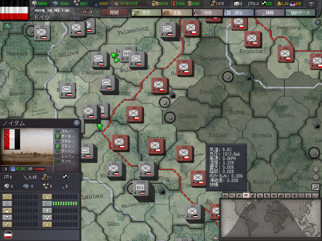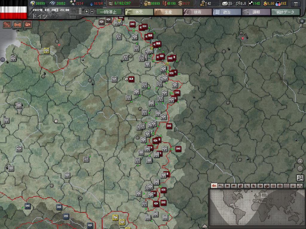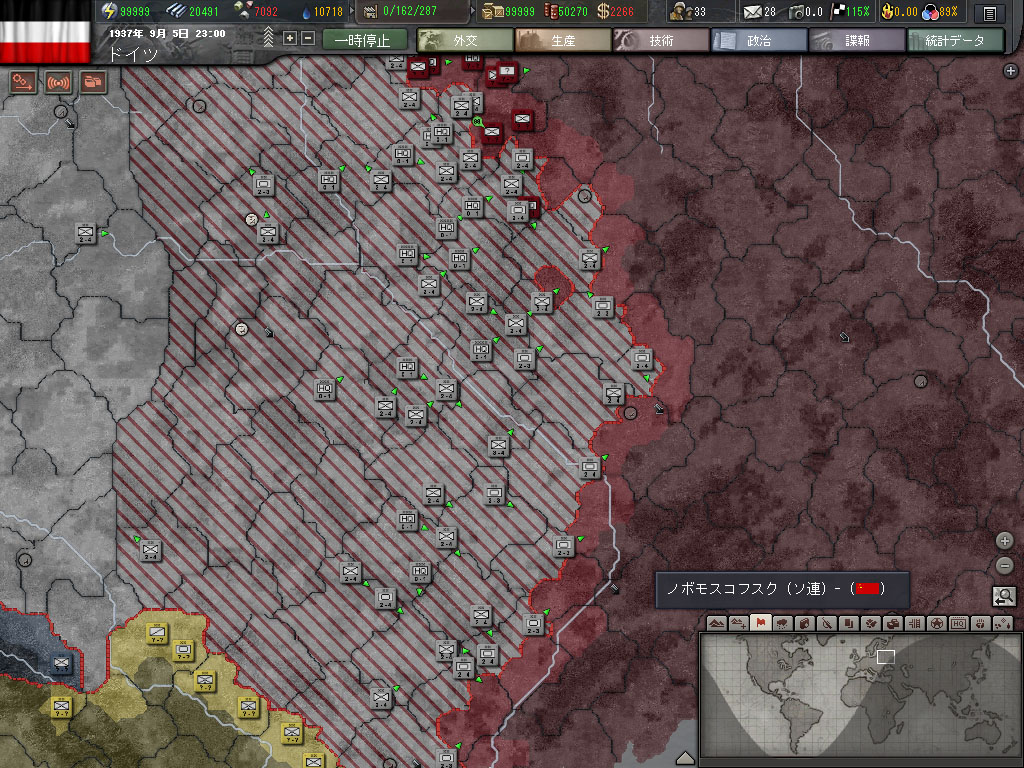 我がドイツの工作によるポーランド制裁戦争は,1937年6月に終結(前回参照)。当然ながらこれはオードブルなので,動員は解除しない。ベルリン司令部には「防御」の指示を出し,旧ポーランド・ソビエト国境にドイツ軍を整列させる。