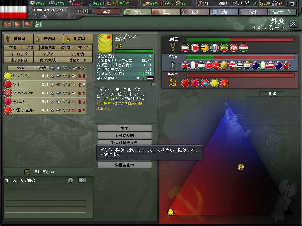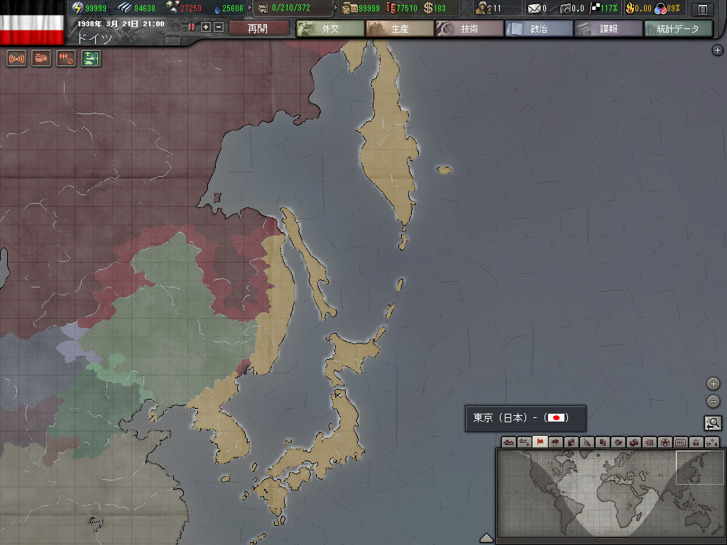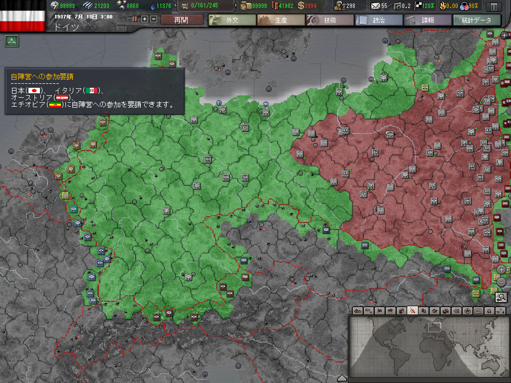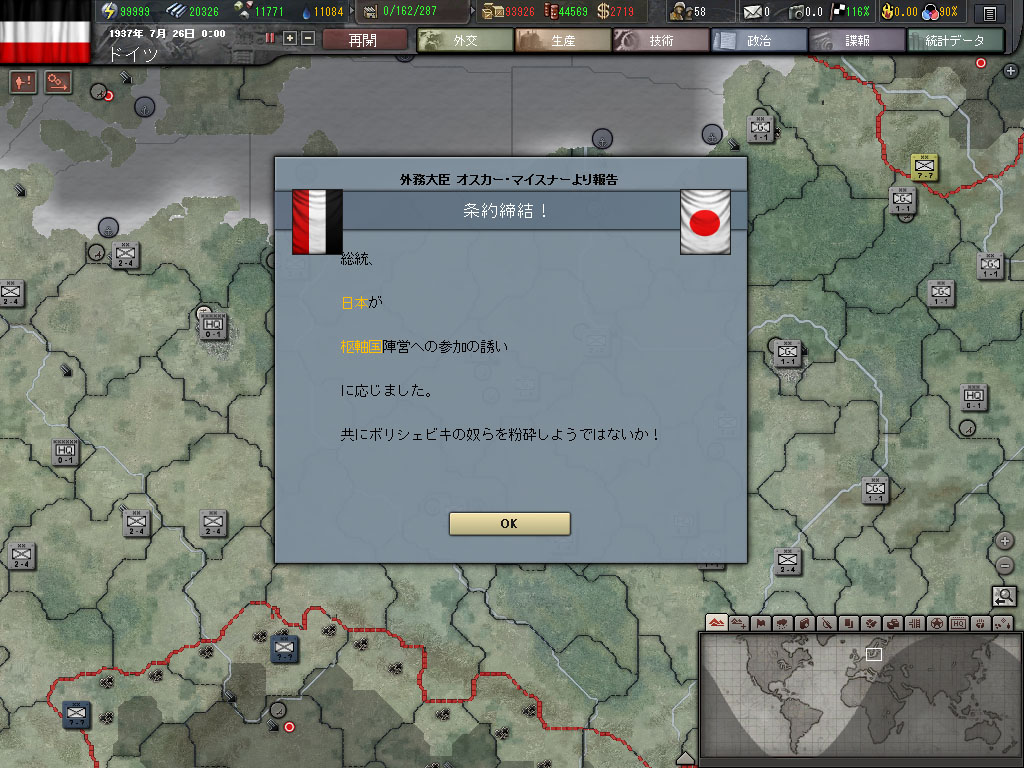 というわけで,外交的にドイツに接近していた日本を,枢軸陣営に誘うこととする。これまでは「あんなアメリカホイホイを陣営に入れてたまるか」という潜在的な意識が働いていたのだが,HoI3の日本はあまりアメリカと喧嘩しないので(というか,できる体力が1941年頃には残っていないので),ここは一つシベリアの不毛の荒野に赤軍を釣る餌になっていただく,もとい極東戦線を日本軍にお任せしようではないか。