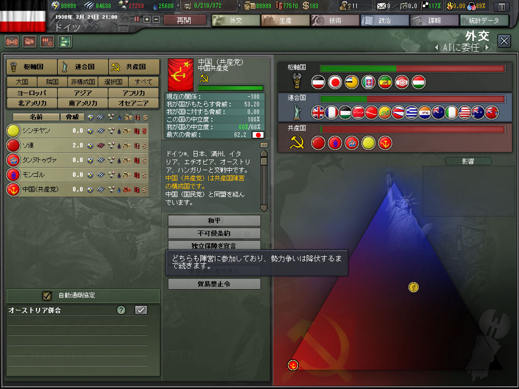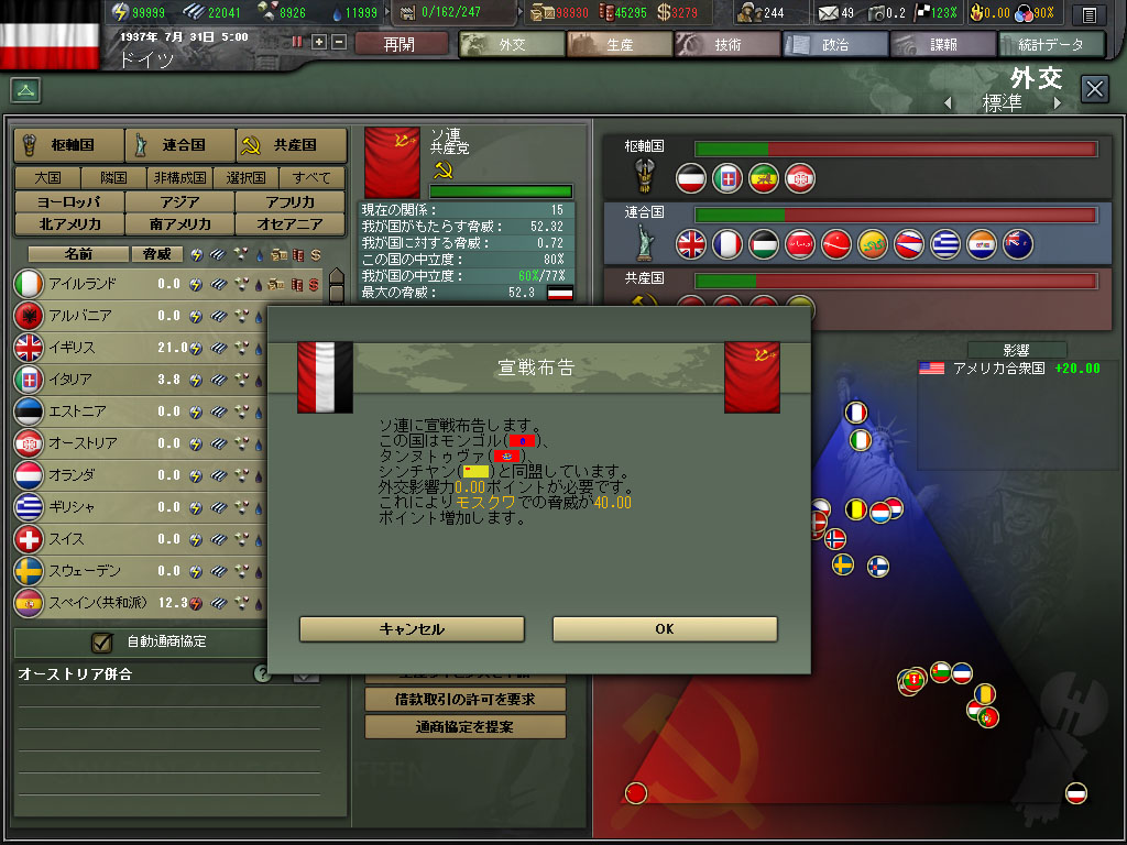 方針が決まったので,日本を枢軸に加えてから,ソビエトに対して全面戦争を宣言。中国戦線で右往左往していた日本軍は,突如北からの脅威にも晒されて,さらに右往左往しているが,じきに北からの脅威はなくなるから頑張ってくれたまえ。