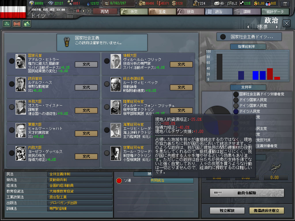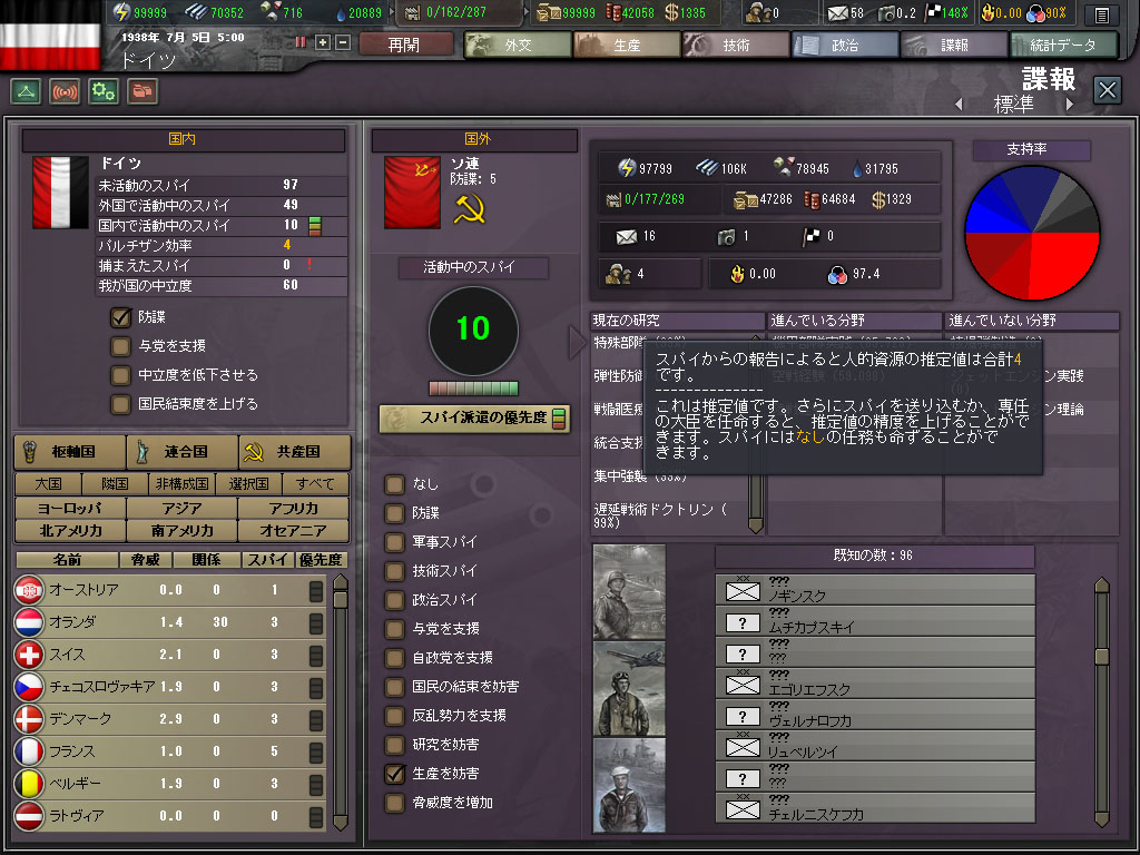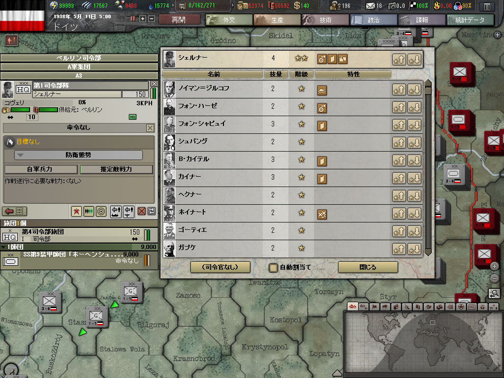 筆者がHoI3でドイツをプレイするのは素晴らしく久しぶりなのだが,かつてプレイした頃のバージョンだと,ドイツ占領地では雲霞のようにパルチザンが湧いたものだから,それに対応するためにと思って守備隊を大量生産しておいたのだ。守備隊指揮ツリーの最高司令官に,ヒムラーを登用してまで。