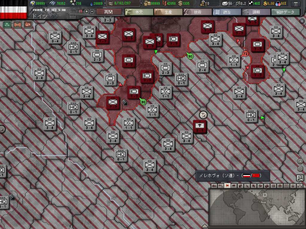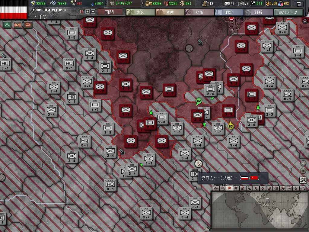 もう一つ,これはケアレスミスなのだが,今回のドイツ軍の機甲打撃軍主力は「軽戦車」であったという衝撃の事実がある。実はドイツはゲーム開始時に「中戦車」の技術を持っておらず,初期型の中戦車が投入できるのは,独ソ戦が始まってからになってしまうのだ。にもかかわらず,必死で中戦車の技術改良を進め,軽戦車技術を放置していたのは,決定的とまではいかなくても大きなマイナス要因といえるだろう。