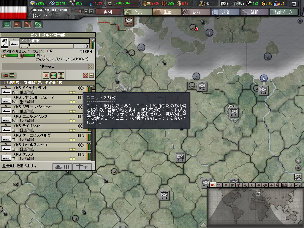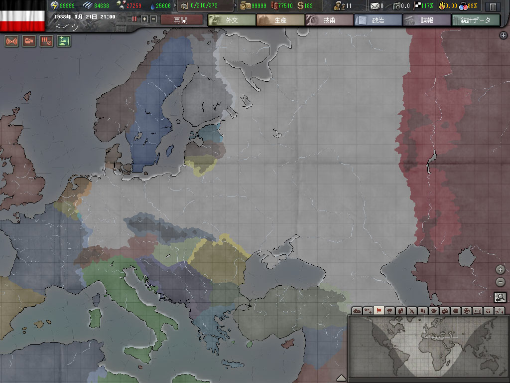 とても広くなったドイツ。東欧に細かい中立国家が大量にあって,彼らはそれぞれ,いつでも対独戦する気マンマンってのが最大の問題か。ここから連合国と喧嘩するにしても,最低2年くらいは準備が必要そう……てかVP的に連合国と戦争する必要ないし