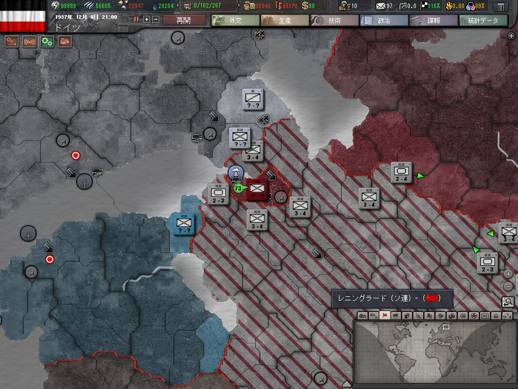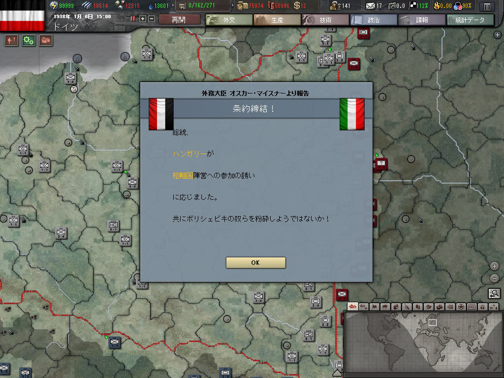 ポーランドを併合した直後。「イタリアや日本が仲間になりたそうにこちらを見ている! 仲間にしてあげますか?(はい/いいえ)」的な状態。戦線の補強をしてくれるんならいいんだけど,墺伊を入れても伊軍こっちに来ないのよね