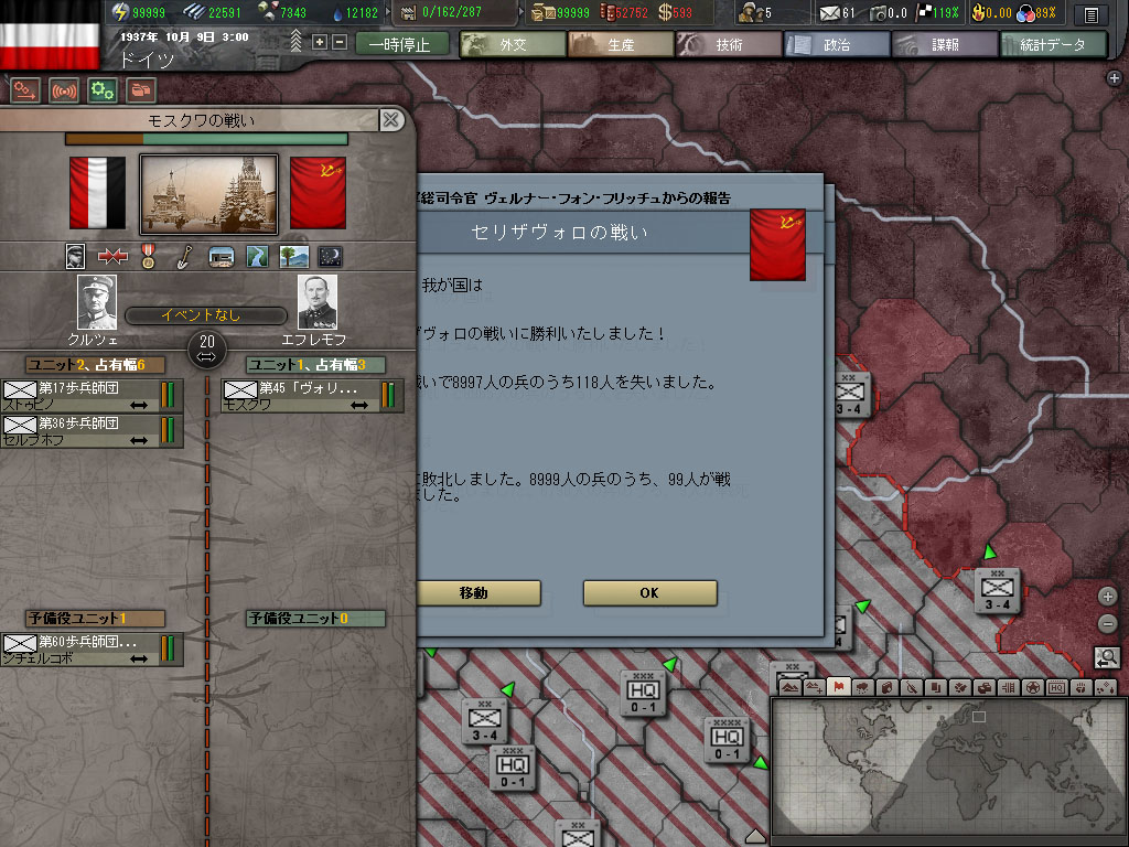 ことに凄まじかったのは中央軍集団で,その勢いは赤軍の戦線を完全に引き裂き,無人の野を爆走していく。どう見ても,これは勝ちモードである。史実に比べて1か月以上遅い開戦で,冬の到来が怖いといえば怖いが,今回ドイツ軍は史実よりもずっとモスクワに近いラインをスタート地点としている――ポーランド全体が,ドイツのものなのだから。
