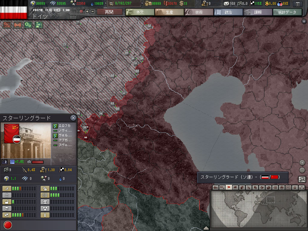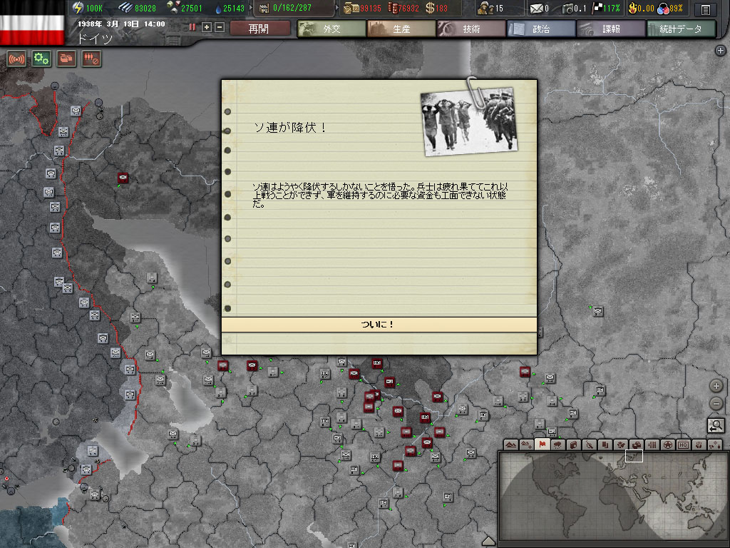 初期の目的は果たしたことだし,今回のプレイはここで終了とさせていただきたい。ソビエトロシア全域を占領したドイツが,人的資源の問題を克服するのは時間の問題でしかないし,時間を味方につけてしまった強国なんて,チュートリアルでもなければやる意味はない。