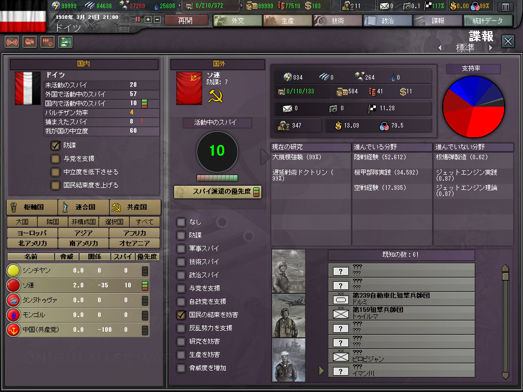 というわけで,連載5回を使うことになったが,アメリカでゲームの概略および技術開発,ソビエトで陸軍指揮系統の編成方法,ドイツで外交と諜報と,HoI3の持っているギミックを一通り紹介してみた。この他にも,戦略爆撃による国民意識の低下,戦闘消耗による厭戦機運の上昇といった要素はあるのだけれど,大国だと,あまりそのあたりは問題にはならない。