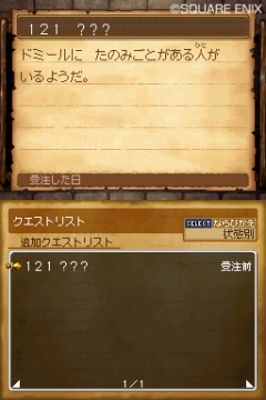 クエスト発生条件を満たしていない場合は,「このクエストは今は受けられないようだ」と,依頼主にゲーム中で会っていない場合はクエストタイトルが「???」と表示される。ただし,クエスト発生条件を満たしていて依頼主に会っていない場合は,クエストリストの上画面に,依頼主のヒントが表示されるので,それを見て依頼主に会いに行こう。